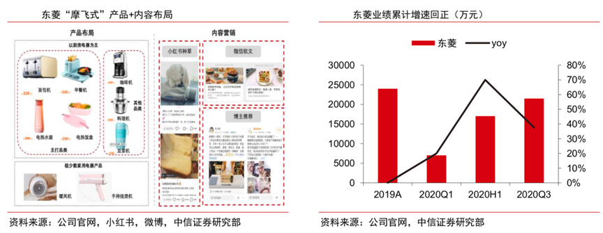 經典案例:根據(jù)公司官網(wǎng)、小紅書、微博、中信證券研究部等綜合資訊表明,2018 年,東菱在鞏固原有優(yōu)勢品類的基礎上,陸續(xù)推出多功能早餐機、加熱便當盒等網(wǎng)紅產品,將使用場景從廚房延伸到客廳、辦公室等生活場合;營銷上,積極引入“爆款產品+內容營銷”的打法;品牌定位上,主推西式浪漫的情趣生活,并對品牌進行富有法國風情的詮釋。