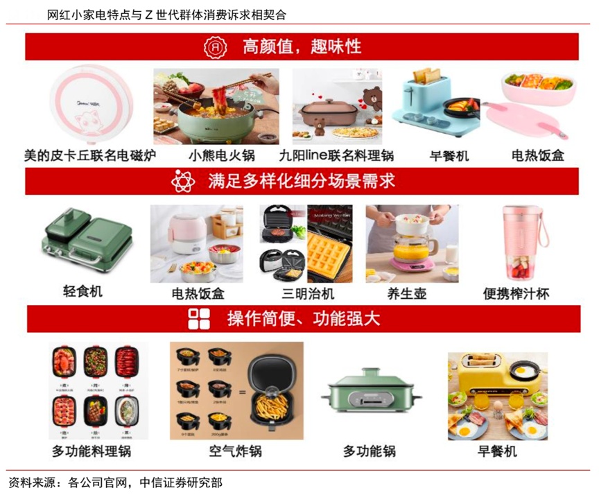 經(jīng)典案例:根據(jù)各公司官網(wǎng)、中信證券研究部等綜合資訊表明,年輕群體品牌忠誠度降低、產(chǎn)品功能需求多樣、購物存在功能、顏值、體驗(yàn)、社交多維度考量,“體驗(yàn)式消費(fèi)”和“悅己式消費(fèi)”已成為主要消費(fèi)特征??v觀爆款小家電其均具備(顏值高、設(shè)計(jì)感強(qiáng);直擊細(xì)分場(chǎng)景痛點(diǎn);多功能、易操作)的特點(diǎn),深度契合了年輕消 費(fèi)群體的新偏好、新訴求。