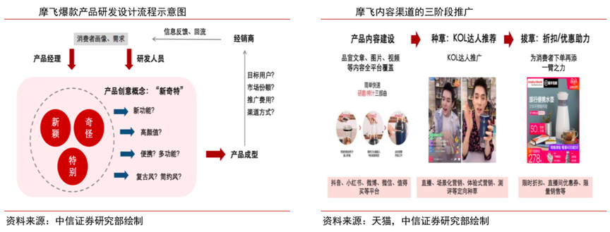 經(jīng)典案例:根據(jù)中信證券研究、天貓等綜合資訊表明,摩飛深化“爆款產(chǎn)品+內(nèi)容營銷”打法,在內(nèi)部專門成立國內(nèi)品牌事業(yè)部,由不同的專業(yè)銷售團(tuán)隊(duì)負(fù)責(zé)不同品牌的品牌策劃、研發(fā)設(shè)計(jì)和品質(zhì)管控。并由內(nèi)容經(jīng)理通過社交電商和內(nèi)容電商進(jìn)行營銷推廣,基本過程可以劃分為產(chǎn)品內(nèi)容基礎(chǔ)建設(shè)、種草、拔草三個(gè)階段,通過碎片化的營銷達(dá)到高覆蓋和深滲透 的效果,最終成功形成了多款爆品。