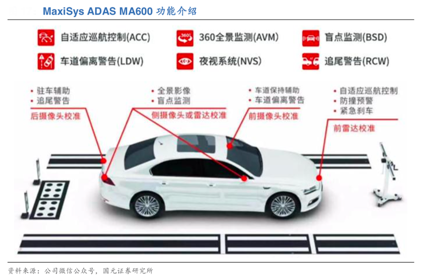 經(jīng)典案例:根據(jù)公司微信公眾號、國元證券研究所等綜合資訊表明,2020 年 11 月,道通科技新一代可折疊ADAS 校準系統(tǒng) MA600 正式發(fā)布。MaxiSys ADAS MA600 支持 ACC 自適應巡航控制系統(tǒng)標定、LDW 車道偏離警告系統(tǒng)標定、NVS 夜視系統(tǒng)標定等六大核心功能,車型覆蓋率高達 95%。該產(chǎn)品不僅為客戶提供了更完整的診斷功能軟件和全面精確的校準工具,而且解決了傳統(tǒng)產(chǎn)品笨重不便運輸?shù)男袠I(yè)痛點,首次實現(xiàn)了單人可折疊攜帶設計,樹立標定設備新標準。