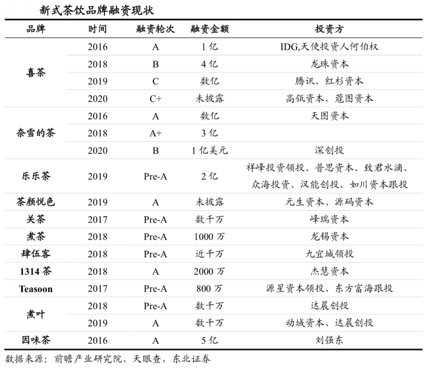 經(jīng)典案例:資本驅(qū)動企業(yè)再增長。根據(jù)前瞻產(chǎn)業(yè)研究院、天眼查、東北證券等綜合資訊表明,新式茶飲行業(yè)已經(jīng)成為了備受青睞的投資風(fēng)口,眾多知名品牌已經(jīng)完成了 A 輪和 Pre-A 輪融資。創(chuàng)立時間最早的喜茶目前已經(jīng)完成了第四輪的 C+輪融資,同時主打“新茶飲+軟歐包”的奈雪的茶也在2020年獲得了由深創(chuàng)投領(lǐng)投的 B 輪融資 1 億美元。