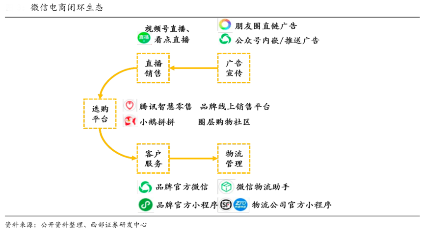 經(jīng)典案例:根據(jù)公開資料、西部證券研發(fā)中心等綜合資訊表明,微信電商形成了以“視頻號(hào)+微信小程序+公眾號(hào)/社群”為主線的電商閉環(huán)。微信電商利用微信龐大的流量池,在視頻號(hào)的引流下,將用戶帶入商家小程序完成購(gòu)買,通過(guò)營(yíng)銷活 動(dòng)將用戶引入微信社群/公眾號(hào),直接對(duì)接終端消費(fèi)者,了解用戶的真實(shí)訴求,保證用戶的活躍和留存,方便對(duì)私域流量進(jìn)行沉淀。