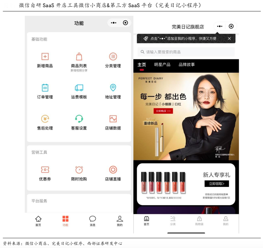 經(jīng)典案例:根據(jù)微信小商店、完美日記小程序、西部證券研發(fā)中心等綜合資訊表明,微信電商主要依托于微信小程序開展電商交易,微信小程序目前分為三種類型,其中一種是微信自研 SaaS 平臺(tái)——微信小程序:主打 0 元開店,分為個(gè)人開店和企業(yè)開店,功能較 少,只能滿足商品的交易,對(duì)于營(yíng)銷工具的提供較少,另外對(duì)于店鋪的裝修以及推廣、運(yùn)營(yíng)數(shù)據(jù)的下載分析欠缺,不能滿足品牌商家的多樣化需求。