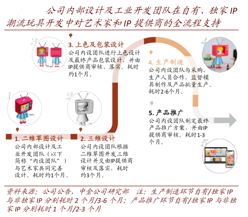 經(jīng)典案例:根據(jù)公司公告、中金公司研究部等綜合資訊表明,泡泡瑪特憑借多年打造的潮玩一體化產(chǎn)業(yè)鏈,可以實(shí)現(xiàn)在藝術(shù)家發(fā)掘、IP 開發(fā)運(yùn)營(yíng) 支持以及下游推廣三個(gè)核心環(huán)節(jié)的全方位支持,不僅提高了 IP 孵化運(yùn)營(yíng)的專業(yè)性和效率, 也對(duì)有志于加入潮玩文化圈的藝術(shù)家和設(shè)計(jì)師具有強(qiáng)大的吸引力。