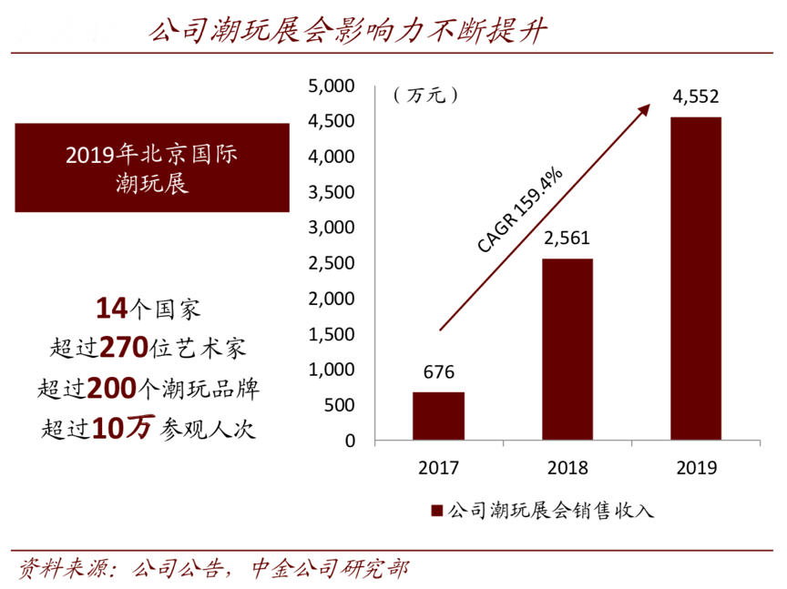 經(jīng)典案例:根據(jù)公司公告、中金公司研究部等綜合資訊表明,2017年后泡泡瑪特公司每年在北京、上海各開辦一次國(guó)際潮玩展(除 2020 年受新冠 疫情影響外),展會(huì)規(guī)模及影響力不斷擴(kuò)大,其已成為中國(guó)最大潮流玩具展,成為合作的大平臺(tái)。2019年北京國(guó)際潮玩展吸引來(lái)自 14 個(gè)國(guó)家超過(guò) 270 名藝術(shù)家,參觀人次超過(guò) 10 萬(wàn)。