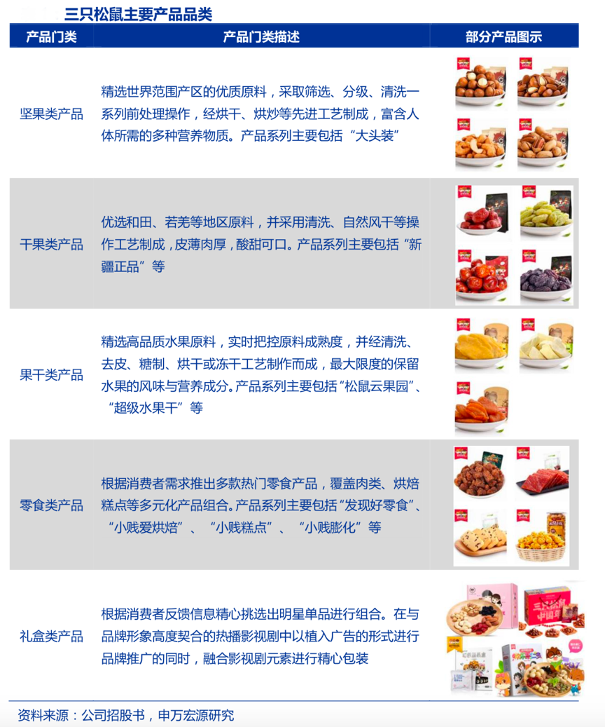 經(jīng)典案例:根據(jù)公司招股書、申萬宏源研究等綜合資訊表明,2012 年,三只松鼠公司以高價(jià)值堅(jiān)果作為切入點(diǎn),通過滿足消費(fèi)者健康化、多元化需求,從而迅速打開市場,占據(jù)了“三只松鼠=堅(jiān)果”的消費(fèi)者心智。 2014 以來公司將品類延伸至干果、果干、花茶、零食等多品類休閑食品,現(xiàn)今公司以“堅(jiān) 果、烘焙、肉制品、果干”為四大核心品類,SKU 超 600 款,通過打造一站式采購平臺,發(fā)揮品類的協(xié)同效應(yīng)。