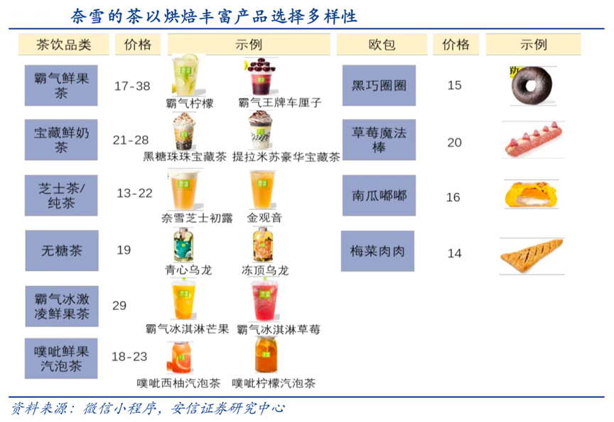 經(jīng)典案例:根據(jù)微信小程序、安信證券研究中心等綜合資訊表明,奈雪目前主要店型提供“茶+歐包” 核心產(chǎn)品,現(xiàn)制茶飲主要有 35 種,以水果茶為核心進(jìn)行組合開發(fā),同時(shí)奈雪酒屋 BlaBlaBar 提供多種酒類產(chǎn)品,奈雪 PRO 提供咖啡及早餐服務(wù),奈雪夢(mèng)工廠則為“新品實(shí)驗(yàn)室”,提供了超 1000 個(gè) SKU, 產(chǎn)品包括烘焙、牛排、零售、酒吧、茶飲、咖啡、娃娃機(jī)等15個(gè)板塊。