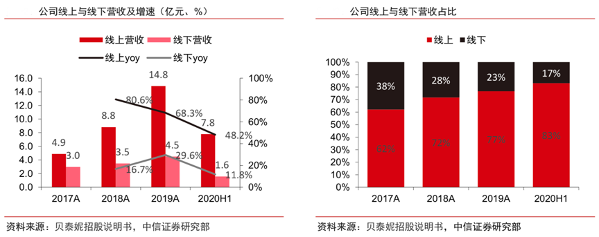 經(jīng)典案例:根據(jù)貝泰妮招股說明書、中信證券研究部等綜合資訊表明,貝泰妮公司早期從線下渠道起家,依靠滇虹藥業(yè)的藥企背景和渠道資源,迅速與相關(guān)醫(yī)院建立合作關(guān)系,在臨床和 OTC 渠道 鋪開。2012 年其設(shè)立電商部門,緊抓電商風(fēng)口,大力發(fā)展線上渠道。2017-2019 年其線下與線上渠道收入 CAGR 分別為 23.0%與74.3%。2020H1,其線上收入占比已高達(dá) 83.2%,毛利占比達(dá) 82.0%。