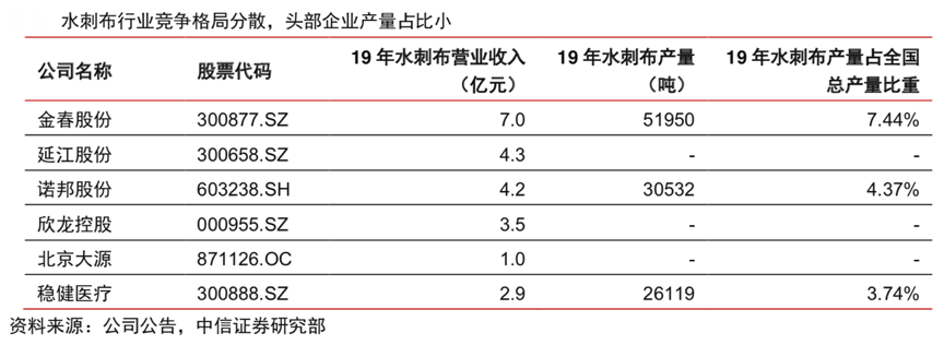 經(jīng)典案例:根據(jù)公司公告、中信證券研究部等綜合資訊表明,水刺布市場(chǎng)相對(duì)無(wú)紡布整體更加集中,但仍是分散市場(chǎng)。根據(jù)幾家披露產(chǎn)量的無(wú)紡布 企業(yè),金春股份/諾邦股份/穩(wěn)健醫(yī)療 2019 年產(chǎn)量分別占全國(guó)水刺布產(chǎn)量的7.44%/4.37%/3.74%,三家合計(jì) 15.55%,同時(shí)結(jié)合延江股份、欣龍控股的水刺布收入水 平,相對(duì)無(wú)紡布行業(yè)整體的集中度更高,其需要點(diǎn)亮產(chǎn)業(yè)新價(jià)值要素。