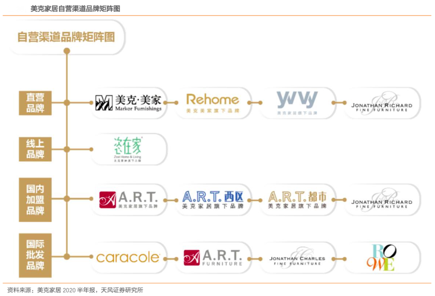 經(jīng)典案例:根據(jù)美克家居2020年半年報(bào)、天風(fēng)證券研究所等綜合資訊表明,美克家居公司通過(guò)多種渠道組合完成對(duì)旗下品牌的生產(chǎn)和營(yíng)銷(xiāo),以觸及更廣泛的消費(fèi)者。其目前直營(yíng)品牌主要是美克美家、Rehome、YVVY;國(guó)際品牌在國(guó)內(nèi)通過(guò)加盟方式營(yíng)銷(xiāo)的有 A.R.T.、 A.R.T.西區(qū)、A.R.T.都市以及 Jonathan Richard(Jonathan Charles 母品牌);國(guó)際批發(fā)品牌包括 caracole、A.R.T.、Jonathan Charles、ROWE;線上品牌為恣在家 Zest Home。