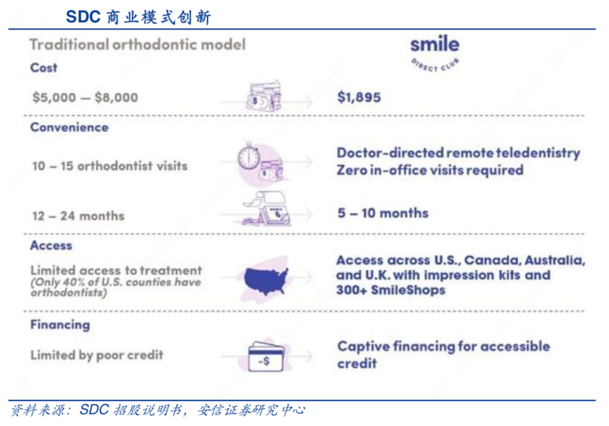 經(jīng)典案例:根據(jù)SDC招股說明書、安信證券研究中心等綜合資訊表明,SDC公司成立以來業(yè)務(wù)高速發(fā)展,截至2019 年上市前,其累計(jì)完成 70 萬例隱形正畸案例,業(yè)務(wù)范圍覆蓋 4 個(gè)國家,建立 300 多家實(shí)體店(Smile Shop)。2017-2019 年期間公司業(yè)績持續(xù)高速增長,分別實(shí)現(xiàn)營業(yè)收入 1.46 億美元、4.23 億美元、7.50 億美元。但是與此同時(shí),SDC 的商業(yè)模式市場爭議較大,由于直接面向消費(fèi)者的方式跳過了正畸醫(yī)生的診療環(huán)節(jié),存在一定的醫(yī)療事故風(fēng)險(xiǎn),受到美國正畸醫(yī)師協(xié)會(huì)和部分牙科委員會(huì)的批評(píng)和抵制。