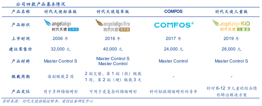 經(jīng)典案例:根據(jù)時(shí)代天使招股說明書、安信證券研究中心等綜合資訊表明,時(shí)代天使公司產(chǎn)品管線豐富,自2006 年推出首款隱形矯治器時(shí)代天使標(biāo)準(zhǔn)版后,又分別于 2016 年推出時(shí)代天使冠軍版,2017 年 推出COMFOS,2019 年推出時(shí)代天使兒童版,旨在形成全面的產(chǎn)品組合。