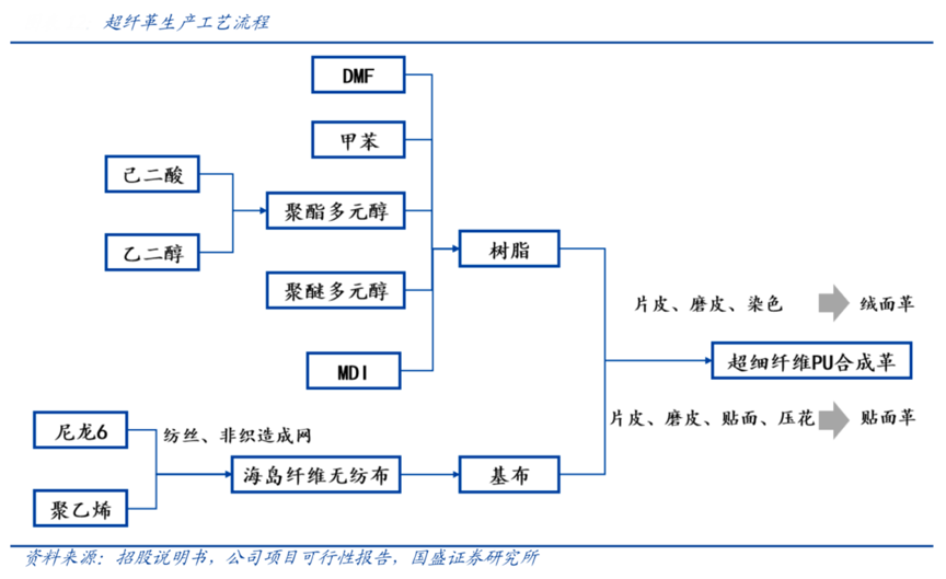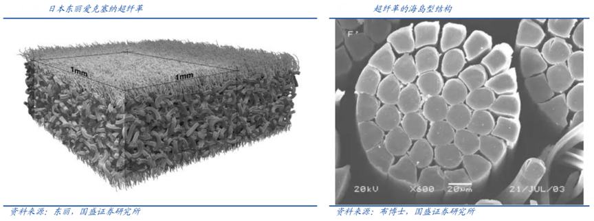 經(jīng)典案例:根據(jù)東麗、布博士、國(guó)盛證券研究所等綜合資訊表明,超纖革的關(guān)鍵工序包括海島纖維紡絲、非織布制造、開纖制造超纖基布和聚氨酯浸漬等工序。其中,海島超纖維加工技術(shù)是基布制造的核心。由于海島型超細(xì)纖維和天然皮革的超細(xì)膠原纖維結(jié)構(gòu)極為相似,使其在各種性能上能與天然皮革媲美,成為天然皮革的最佳替代品。