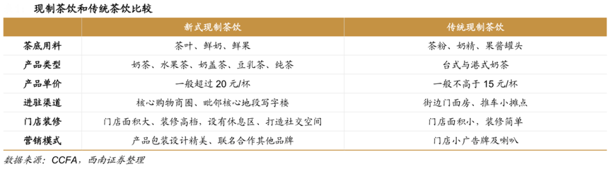 經(jīng)典案例:根據(jù)CCFA、西南證券等綜合資訊表明,與傳統(tǒng)茶飲相比,新式茶飲的“新”主要體現(xiàn)在新鮮食材、新技術、新視角呈現(xiàn)品牌價值三個方面。一是新式茶飲使用新鮮品質食材,用水果、原葉茶、奶蓋及牛乳替代果醬、茶粉、奶精,產品客單價也較高;二是加工制售過程中重視數(shù)字化和新技術應用;三是通過大店、品牌聯(lián)名等新視角呈現(xiàn)品牌價值,重視顧客的體驗和品牌認同感。