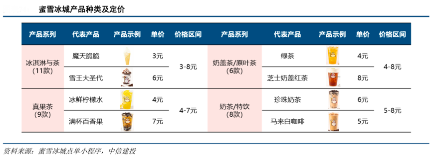 經(jīng)典案例:根據(jù)窄門餐眼、中信建投等綜合資訊表明,蜜雪冰城定位大眾消費,性價比高。其主打冰淇淋與茶、奶茶&特飲、奶蓋茶&原葉茶、真果茶 4 大系 列產品。2020 年 4 月,在我國頭部奶茶品牌宣布漲價并邁入了“30 元時代”之際,蜜雪冰城仍將產品定價在 3 元到 8 元之間,堅持為每一位普通消費者提供物超所值的產品和服務。