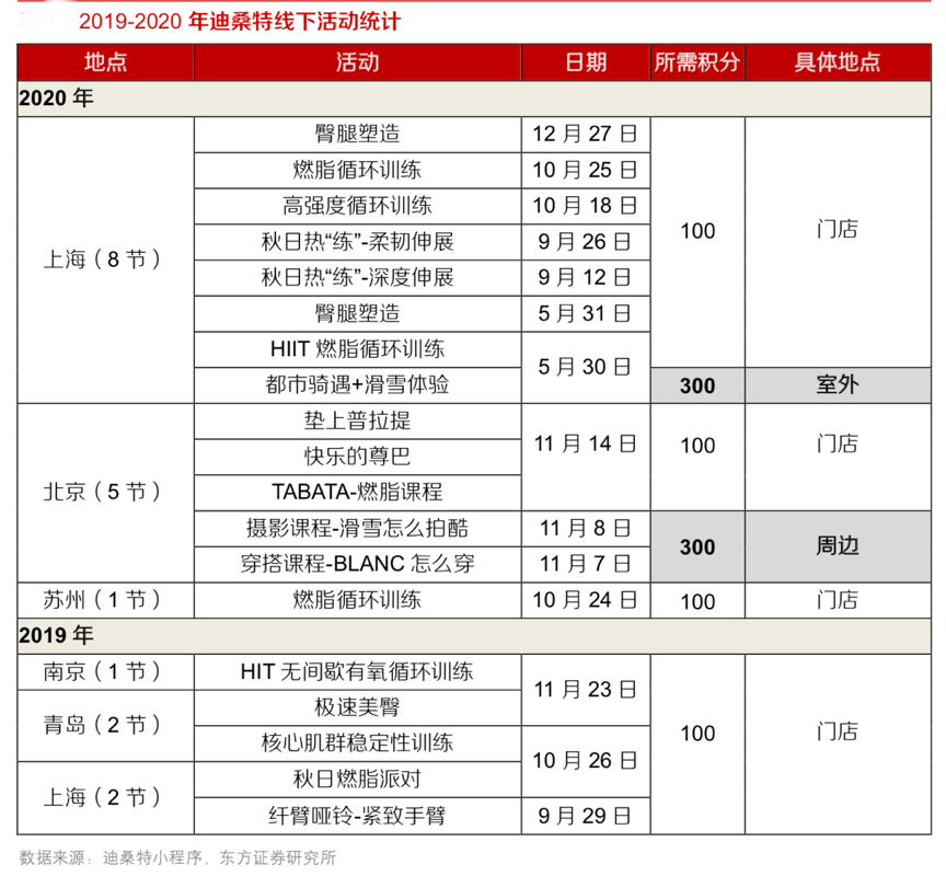 經(jīng)典案例:從迪桑特小程序展示的數(shù)據(jù)來看,2020 年 5 月疫情后,迪桑特線下活動逐步恢復(fù),頻次逐季提升,會員可在小程序中直接通過購物積分進(jìn)行預(yù)約,活動內(nèi)容主要包括健身、燃脂等多種類型,活動均在門店內(nèi)進(jìn)行。此外,迪桑特還會舉辦少量室外騎行、攝影、穿搭等課程,滿足會員需求。