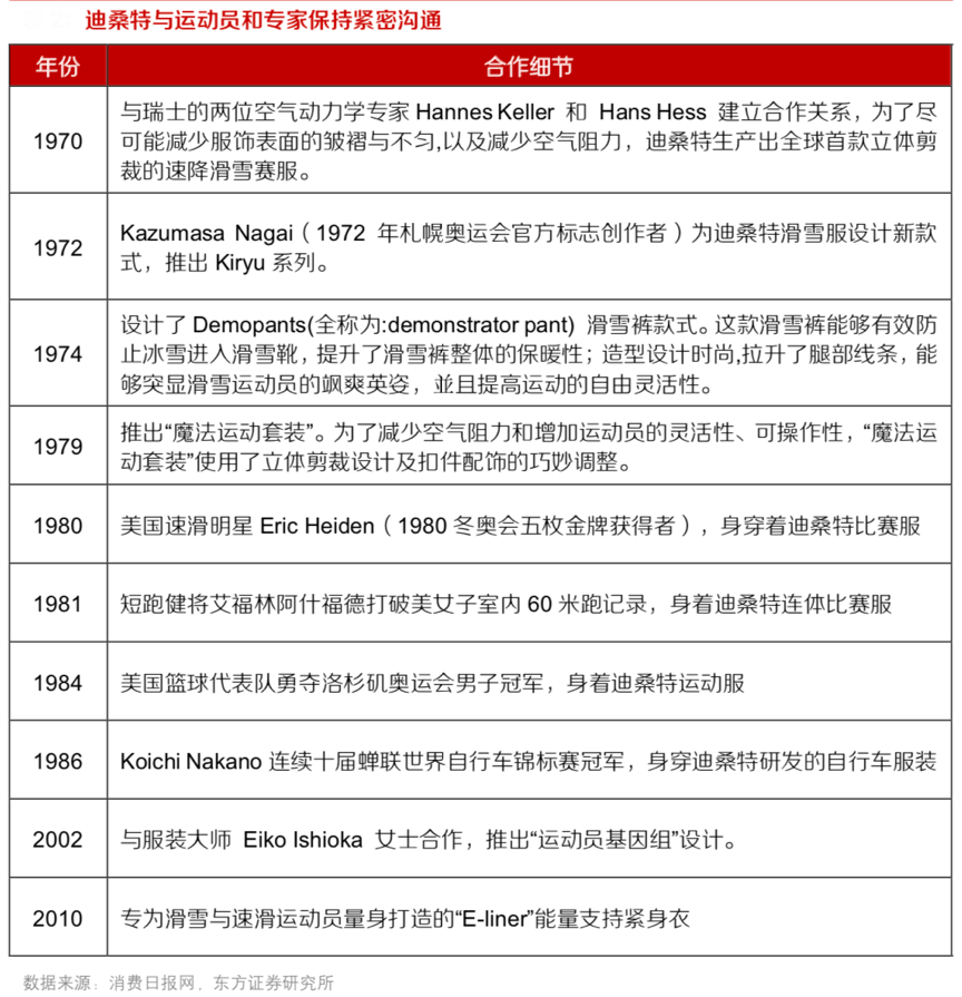 經(jīng)典案例:從品牌歷史來看,迪桑特始終與專業(yè)運動員保持緊密溝通和合作,不斷提升產(chǎn)品專業(yè)性。70 年代 至今,迪桑特與世界各頂級冰雪項目國家隊及運動員保持長期合作關(guān)系,通過與運動員的直接溝通不斷夯實產(chǎn)品的專業(yè)性,運動明星身穿迪桑特比賽服奪冠的場景也極大增加了品牌的曝光度。