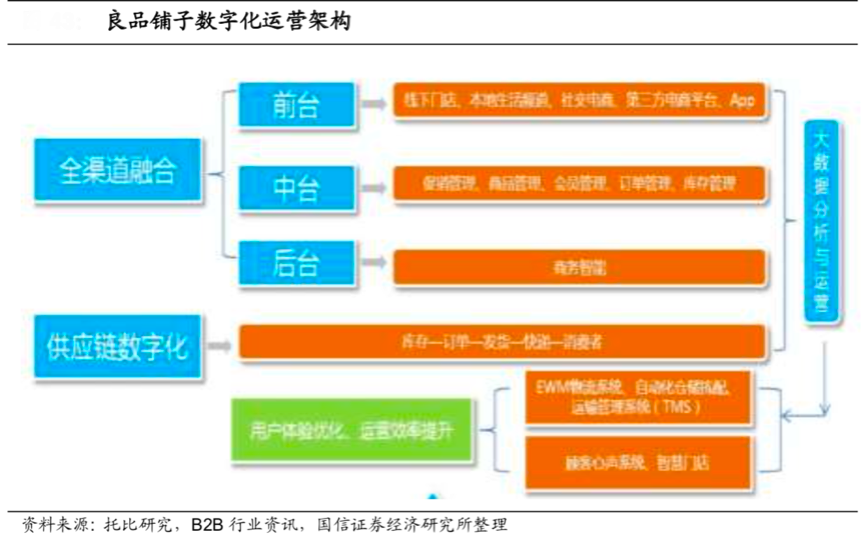 經(jīng)典案例:根據(jù)托比研究、B2B行業(yè)資訊、國信證券經(jīng)濟(jì)研究所等綜合資訊表明,2018年雙11前,良品鋪?zhàn)哟蛲ň€上到線下的通路,把2000多家智慧門店變成前置倉,用戶在線購買,自主選擇門店、外賣和快遞三種配送方式,線上線下全渠道消費(fèi)依賴于數(shù)字化運(yùn)營架構(gòu)的“強(qiáng)力支撐”。
