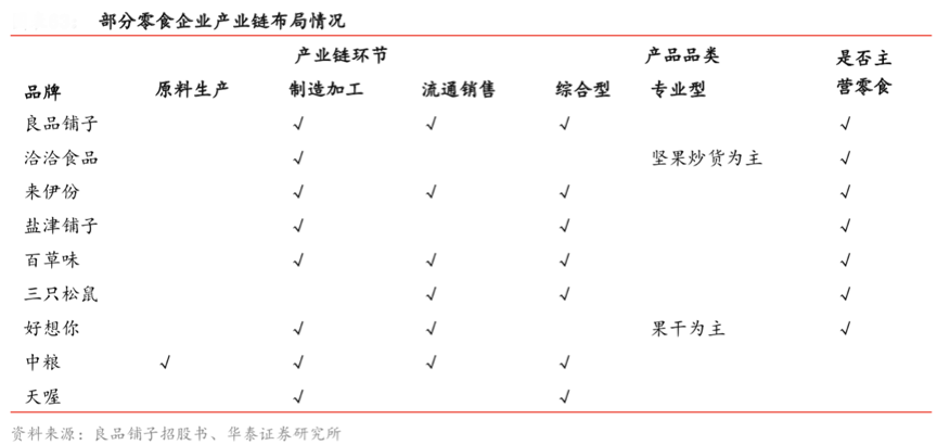 休閑食品的消費(fèi)場景多元化明顯,食品消費(fèi)更趨多樣化,前端的休閑食品“聚合式消費(fèi)”牽引著休閑食品的生產(chǎn)制造及供應(yīng)鏈進(jìn)化,大量的休閑食品企業(yè)正在跨產(chǎn)業(yè)經(jīng)營,從單一的產(chǎn)業(yè)環(huán)節(jié)向“多產(chǎn)業(yè)環(huán)節(jié)共進(jìn)”發(fā)展,食品產(chǎn)業(yè)融合在即。如根據(jù)良品鋪?zhàn)诱泄蓵⑷A泰證券研究所等綜合資訊表明,雨潤、獠子島為典型代表的上游環(huán)節(jié)原料生產(chǎn)企業(yè)向下游滲透,進(jìn)入了零食加工領(lǐng)域;良品鋪?zhàn)?、百草味等下?nbsp;專業(yè)零售企業(yè)在經(jīng)營品牌、研發(fā)產(chǎn)品的過程中向上游滲透,建設(shè)了自有加工工廠;更有大量食品、飲料以及餐飲企業(yè)同時(shí)生產(chǎn)或銷售零食產(chǎn)品,逐步進(jìn)軍全產(chǎn)業(yè)鏈經(jīng)營模式。