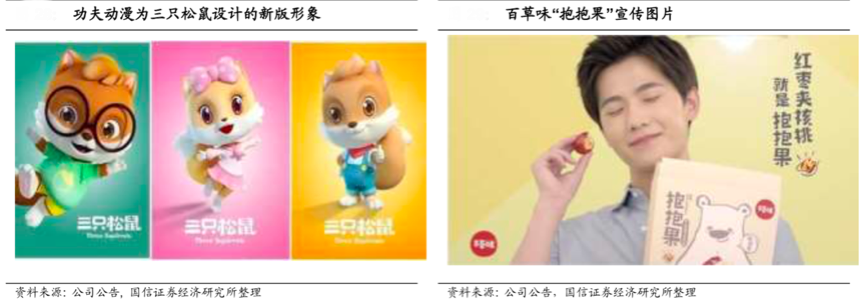 據(jù)公司公告、國信證券經(jīng)濟(jì)研究所等綜合資訊表明,三只松鼠打造“三只 松鼠”超級大IP,開發(fā)制造內(nèi)容和周邊產(chǎn)品,比如與功夫動漫聯(lián)合制作《三只松 鼠》動畫來助力超級 IP,從品牌變成一個(gè)活生生的、有溫度、能夠跟消費(fèi)者進(jìn) 行對話的形象。百草味更把自己定位為“趣味零食探索家”,比如把紅棗包 裹著核桃進(jìn)行趣味解讀,取名為“抱抱果”,更新品牌IP。