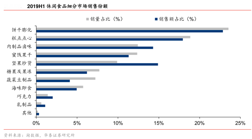 休閑食品品類覆蓋廣泛,有自己的專屬休閑特性,更有自己特色食品的價(jià)值。明星產(chǎn)品帶路,多品類組建,組合品類出擊,成為休閑食品迅猛崛起的“競爭利器”。根據(jù)淘數(shù)據(jù)、華泰證券研究所等綜合資訊表明,休閑食品的細(xì)分現(xiàn)象突出,餅干膨化、糕點(diǎn)點(diǎn)心、肉制品鹵味等品類占據(jù)主體地位,糖果炒貨、糖果果凍等隨之跟進(jìn),強(qiáng)化主題特色及多品類出擊成為休閑食品新零售品牌的“必修課”。