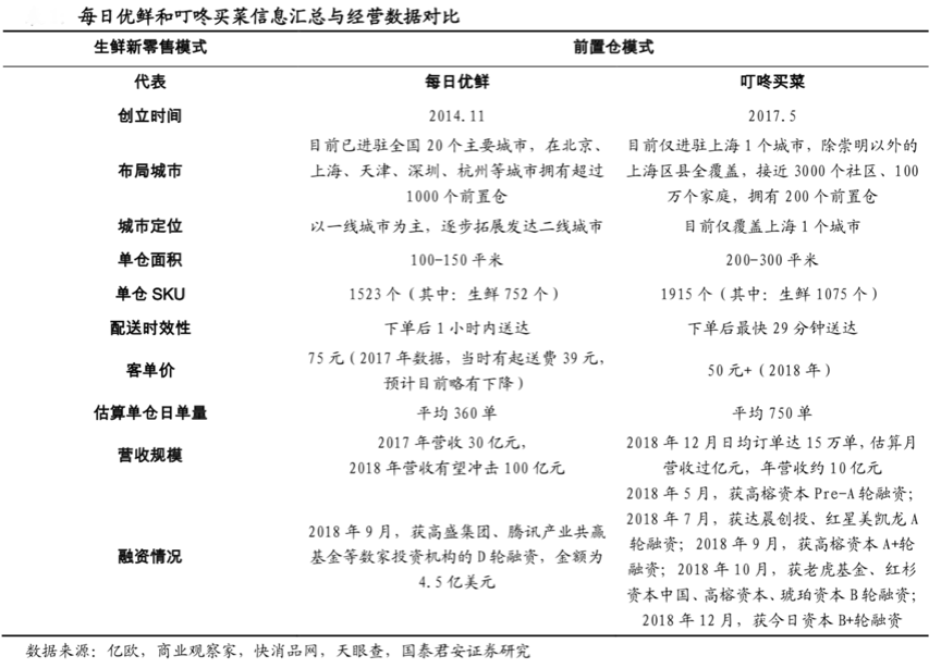 根據(jù)億歐、商業(yè)觀察家、快消品網(wǎng)、天眼查和國(guó)泰君安證券研究等綜合資訊表明,以每日優(yōu)鮮和叮咚買(mǎi)菜為代表的生鮮新零售模式策劃標(biāo)桿,初步解決了“生鮮新零售怎么做”的問(wèn)題,布局國(guó)內(nèi)一二線城市,強(qiáng)化物流的快速配送,以倉(cāng)帶點(diǎn)、以點(diǎn)帶線、以線盤(pán)活區(qū)域,最終實(shí)現(xiàn)“前置倉(cāng)”業(yè)務(wù)的快速崛起。