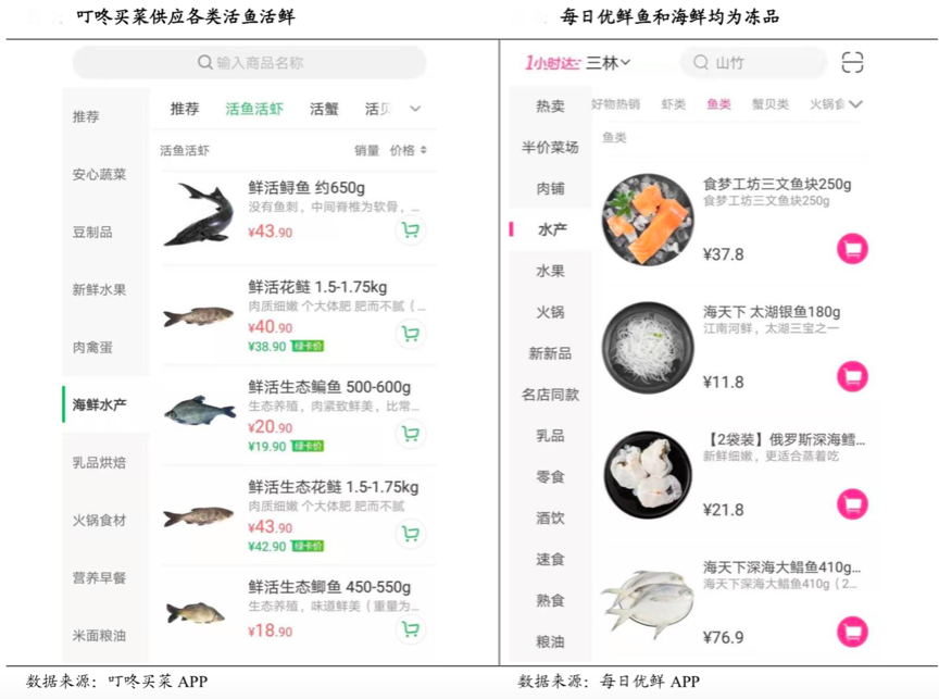 據(jù)國(guó)泰君安研究顯示,前置倉(cāng)領(lǐng)域的又一明星公司叮咚買(mǎi)菜創(chuàng)立于 2017 年 5 月,叮咚買(mǎi)菜在選品方面全面對(duì)標(biāo)菜場(chǎng),根據(jù)叮咚買(mǎi)菜 APP等顯示,其SKU數(shù)為 1915 個(gè),其中生鮮 SKU 1075 個(gè),和每日優(yōu)鮮相比叮咚買(mǎi)菜的蔬菜和豆制品種類(lèi)更豐富,SKU 為 304 個(gè)(每 日優(yōu)鮮 219 個(gè)),同時(shí)還供應(yīng)各種活魚(yú)活鮮,每日優(yōu)鮮的魚(yú)和海鮮類(lèi)產(chǎn)品均為凍品。