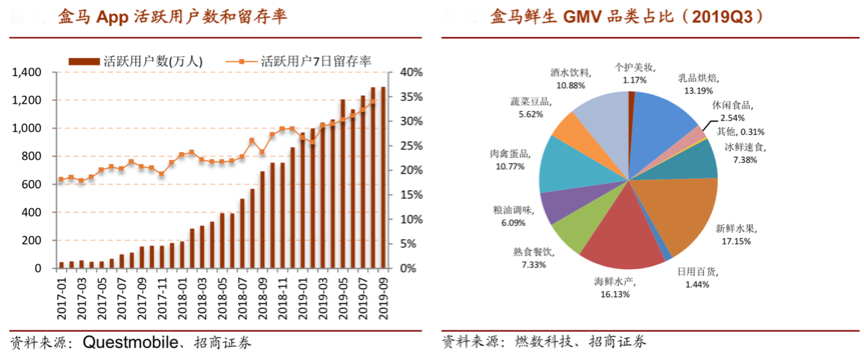 根據(jù)Questmobile、燃數(shù)科技、招商證券等綜合資訊表明,根據(jù)侯毅在投資者大會(huì)上披露,盒馬年度活躍 買家已達(dá) 2000 萬,核心消費(fèi)者在盒馬的年度消費(fèi)在 3000 元人民幣以上。從商品構(gòu)成 看,根據(jù)燃數(shù)科技數(shù)據(jù),2019Q3 盒馬鮮生線上 GMV 中生鮮占比達(dá)到 77%,前三大品 類分別為新鮮水果、海鮮水產(chǎn)、乳品烘焙。