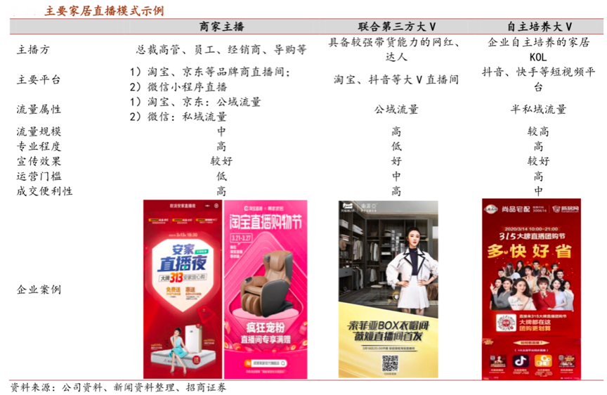 縱觀國內(nèi)主流的家居直播電商模式,根據(jù)各公司資料、新聞資料及招商證券等綜合資訊表明,主流的家居直播方式大致有三種,商家主播、聯(lián)合第三方大V和自主培養(yǎng)大V,直播平臺(tái)主要集中在淘寶、京東等大型家居電商類平臺(tái)及微信小程序/公眾號(hào)、抖音快手短視頻平臺(tái)等,家居電商類平臺(tái)和流量類平臺(tái)占據(jù)了主導(dǎo)地位,通過創(chuàng)新的數(shù)字營銷策劃及“主播強(qiáng)推”,引流成本可控、社交屬性較旨、便利程度較高。
