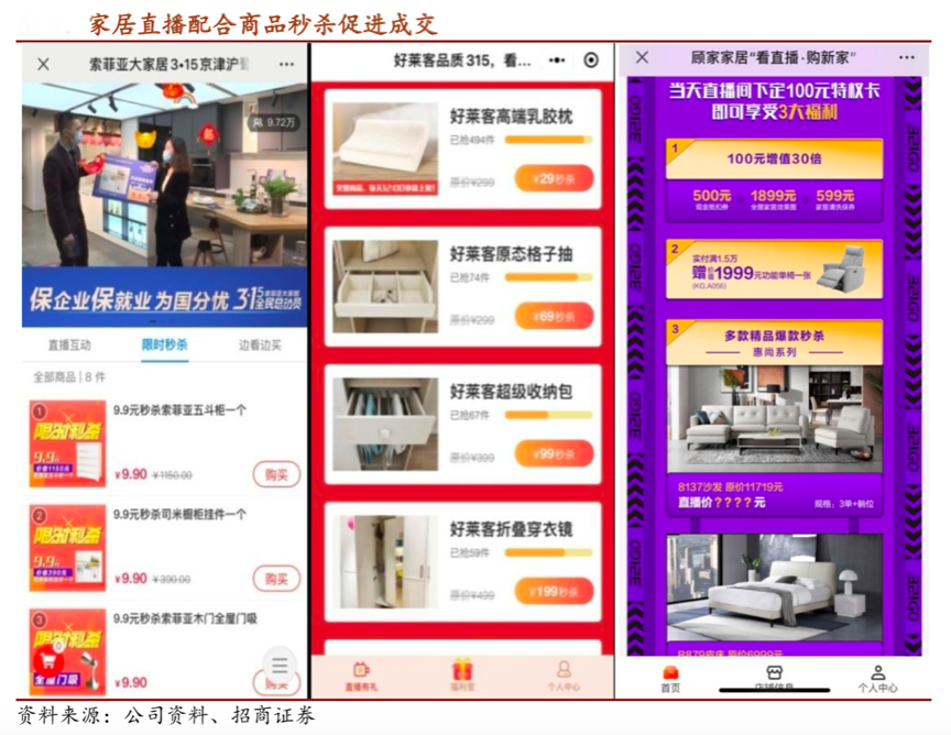分品類活化直播場(chǎng)景,因品類不同而創(chuàng)造不同的“直播方式”。對(duì)于標(biāo)準(zhǔn)化品類及消費(fèi)者可自行購買安裝的品類,直播的意義在于成交,直接產(chǎn)生交易,以“特價(jià)”、“專場(chǎng)”等批量銷售標(biāo)準(zhǔn)家居產(chǎn)品,帶動(dòng)家居產(chǎn)品的關(guān)聯(lián)購買。根據(jù)各品牌公司資料及招商證券等綜合資訊表明,對(duì)于定制化品類,直播的價(jià)值在于“引流吸粉”,增強(qiáng)品牌的吸引力,通過小額定金、限時(shí)秒殺、下單特權(quán)等方式集中向門店引流,引導(dǎo)線上客戶前往門店進(jìn)一步溝通體驗(yàn),線上為線下導(dǎo)流,通過社群互動(dòng)及導(dǎo)購?fù)扑]等積極進(jìn)行“二次轉(zhuǎn)化”。