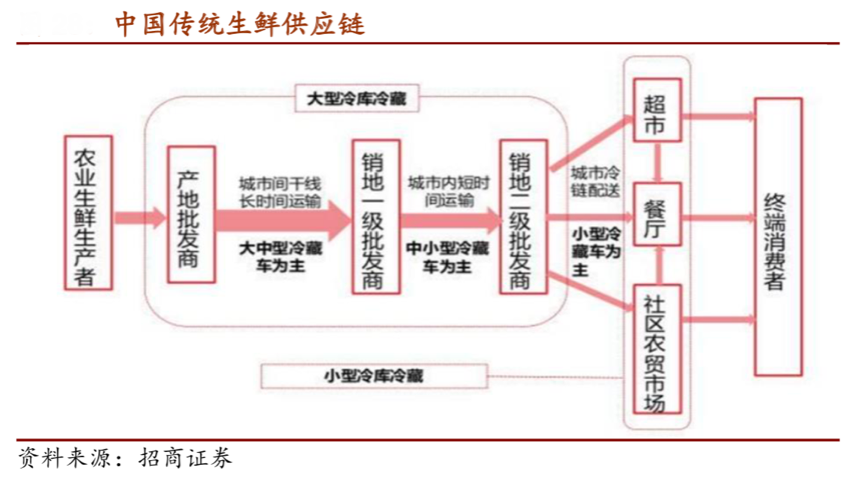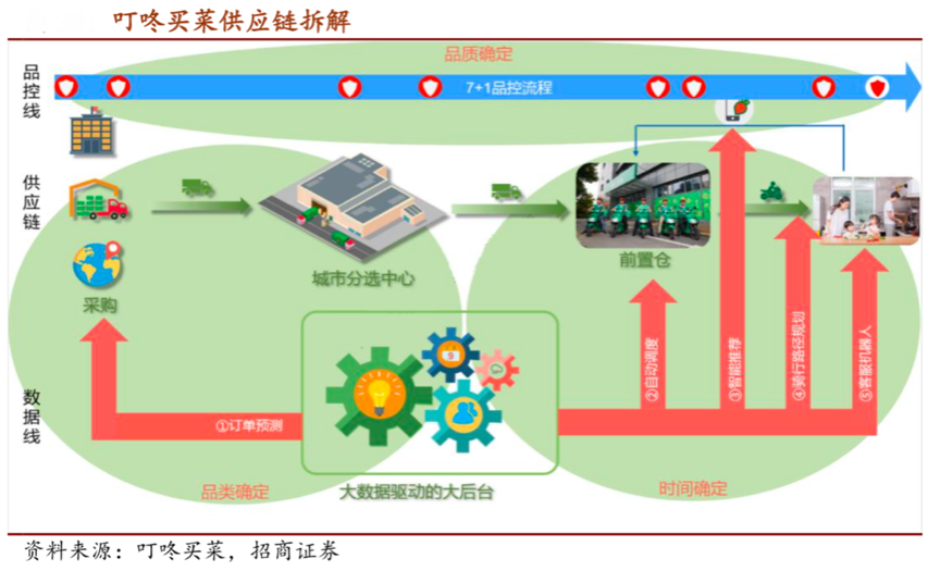 經(jīng)典案例:據(jù)招商證券等資訊顯示,叮咚買菜的供應(yīng)鏈經(jīng)過三段運(yùn)輸:首先產(chǎn)品從源頭出發(fā),經(jīng)冷鏈運(yùn)輸?shù)匠鞘蟹诌x中心,之后再運(yùn)輸?shù)角爸脗},最后用末端配送把商品配送到用戶家里。整條供應(yīng)鏈為用戶創(chuàng)造了三段價值:從源頭到分選中心,實現(xiàn) B2B 生鮮電商的價值;從分選中心到前置倉,實現(xiàn)生鮮超市做的價值;從前置倉配送到用戶家里,實現(xiàn)外賣平臺的價值。
