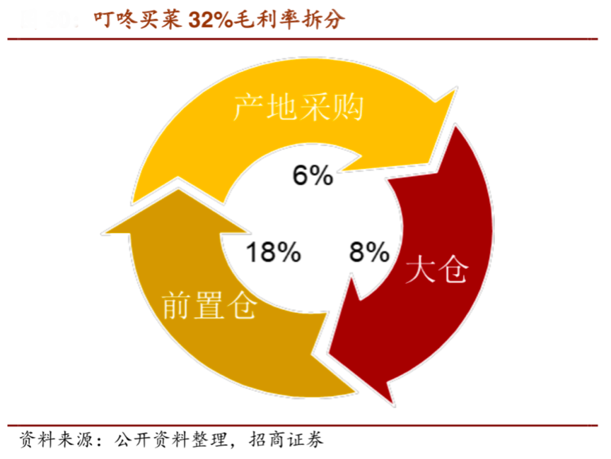 經(jīng)典案例:據(jù)招商證券等資訊顯示,叮咚買菜最新的毛利率為 32%,來自3段低毛利率的總和:從產(chǎn)地采購獲取6%的毛利率;從大倉的加工、生產(chǎn)、運(yùn)輸獲取 8%的毛利率;從前置倉獲取18%的毛利率。