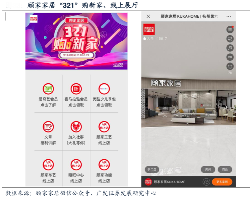 經(jīng)典案例:據(jù)顧家家居微信公眾號、廣發(fā)證券發(fā)展研究中心等綜合資訊表明,顧家以“321”全國互動購物節(jié)吸引粉絲互動,與愛奇世會員體系、喜馬拉雅、優(yōu)酷等公司會員體系積極嫁接,強化會員社群、線上店等的功能,以線上VR展廳生動化展示公司產品,并強化用戶的線上家居消費體驗,亮化家居新零售平臺策劃運營。