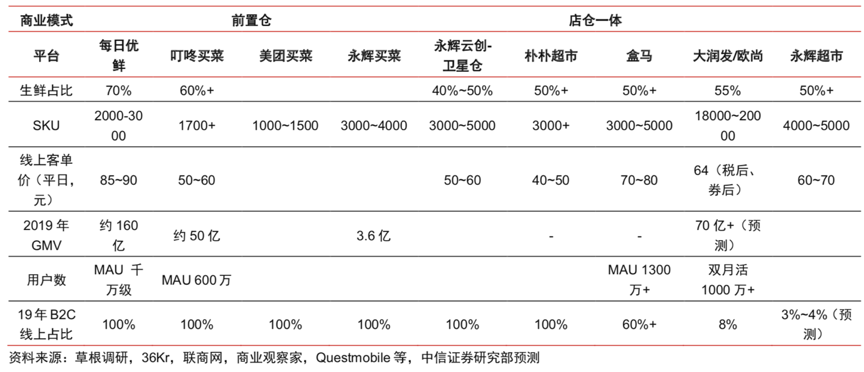 根據(jù)草根調(diào)研、36kr、聯(lián)商網(wǎng)、商業(yè)觀察網(wǎng)、Questmobile、中信證券研究部預(yù)測等綜合資訊表明,國內(nèi)生鮮到家模式大多創(chuàng)始不久,區(qū)域布局多在一二線城市,生鮮占比多在50%以上,線上客單價多在60元以下,線上成為其主要戰(zhàn)場,這些鮮明的特征告訴我們,“生鮮品類結(jié)構(gòu)”構(gòu)建是生鮮到家模式中關(guān)鍵的一環(huán),強有力的生鮮商品是優(yōu)質(zhì)流量入口,更是生鮮到家模式毛利“調(diào)節(jié)器”。