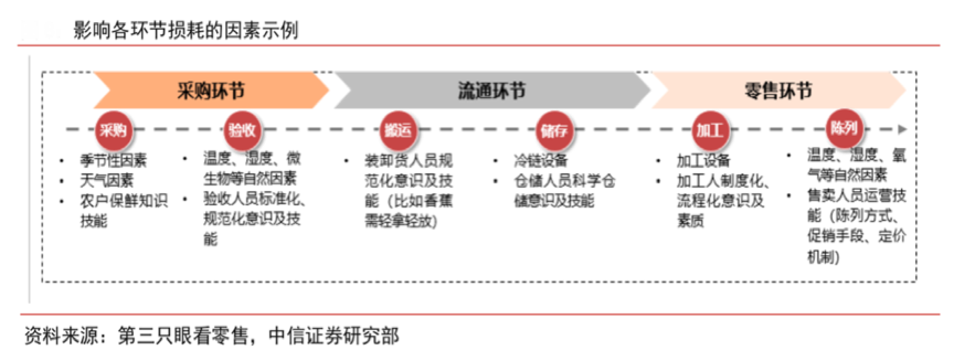 建立健全專業(yè)化的“生鮮供應(yīng)鏈”需要減少不必要的生鮮產(chǎn)業(yè)鏈損耗,提升生鮮美食的商品競爭力。根據(jù)第三只眼看零售、中信證券研究部等綜合資訊表明,采購環(huán)節(jié)、流通環(huán)節(jié)及零售環(huán)節(jié)等各生鮮產(chǎn)業(yè)鏈環(huán)節(jié)都存在一定的“生鮮損耗”,優(yōu)秀的生鮮零售品牌需要從上游商品化、中游市場化和下游品牌化“產(chǎn)業(yè)鏈整合”入手,提升區(qū)域內(nèi)網(wǎng)點密度以實現(xiàn)快速配送,提升“供應(yīng)鏈水平”強化產(chǎn)品豐富度、品質(zhì)、價格等,從整體上提升生鮮新零售平臺競爭力。