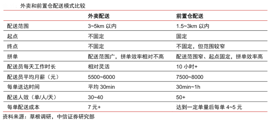 生鮮到家的配送效率是優(yōu)秀生鮮品牌致勝市場的重要一環(huán)。據(jù)草根調(diào)研、中信證券研究部等綜合資訊顯示,外賣和前置倉配送模式有所不同,外賣配送的范圍廣、區(qū)域大、快遞人員時間自由,這些決定了其配送效率有限及配送人效不高,而“前置倉配送”配送區(qū)域相對固定、配送范圍相對集中、訂單相對多樣,其配送人效比較高,也可極大提升配送的整體競爭力。
