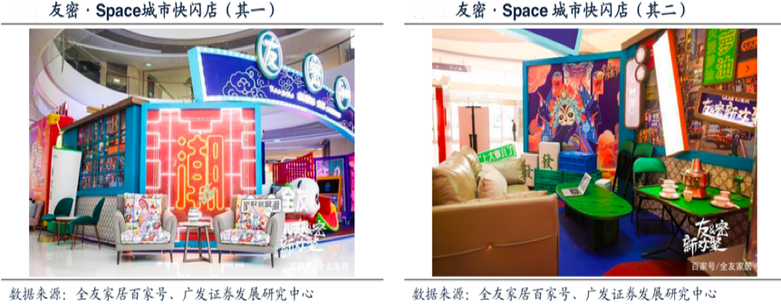 經典案例:根據(jù)全友家居百家號、廣發(fā)證券發(fā)展研究中心等綜合資訊表明,2019年9月,綠色家居品牌全友就在上海合生匯舉辦為期兩天的“友密·Space 城市快閃店”。其通過復古國潮設計提升新穎性和話題度、吸引消費者前來,并且通過互動場景來提升消費者感官體驗;在設計上,該店將復古國潮融入設計,結合京劇生、旦、凈、丑打造四種具有人格標簽的城市會客廳;在互動上,消費者可以體驗各種復古小游戲的“電競局”趣玩會客廳、品嘗美食的“暢飲桌”等。