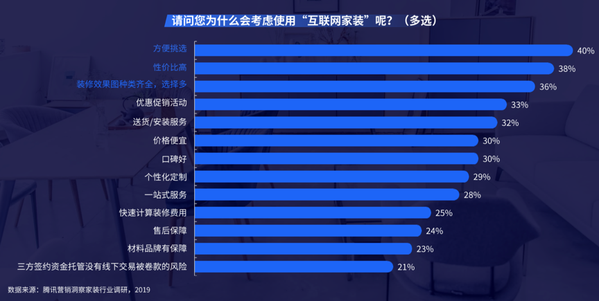 傳統(tǒng)家裝業(yè)務(wù)涉及到建材家居產(chǎn)品選擇、家居生活方案設(shè)計(jì)、家居風(fēng)格挑選、施工隊(duì)伍選擇等多個(gè)環(huán)節(jié),互聯(lián)網(wǎng)家裝在數(shù)字化技術(shù)加持下下單更便捷、消費(fèi)更快速、設(shè)計(jì)方案更集成化,根據(jù)騰訊營(yíng)銷(xiāo)洞察家裝行業(yè)調(diào)研等綜合資訊表明,采購(gòu)便捷、性價(jià)比高、效果全選擇多是互聯(lián)網(wǎng)家裝極具魅力的“三大吸引點(diǎn)”,這是家居消費(fèi)數(shù)字化和智能化的必然結(jié)果,也是互聯(lián)網(wǎng)家裝新零售企業(yè)的相對(duì)競(jìng)爭(zhēng)優(yōu)勢(shì)所在。
