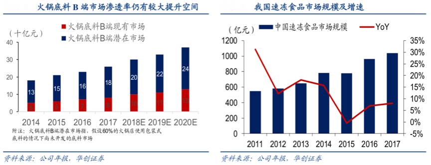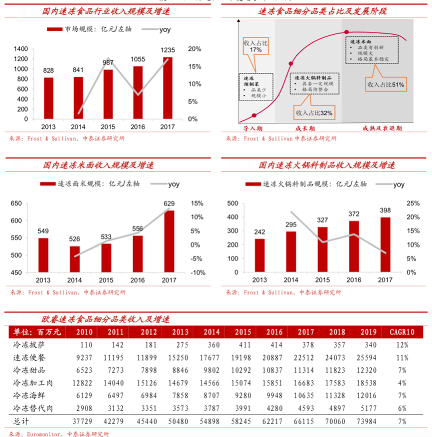 根據(jù) Frost & Sullivan 、中泰證券研究所等綜合資訊表明,中國速凍食品市場中的速凍火鍋料制品收入占比32%,2017 年銷售規(guī)模 398 億元,5 年復(fù)增長率 13.2%;速凍面米制品收入占比 51%,2017 年銷售規(guī) 模 629.0 億元,5 年復(fù)增長率 3.5%。