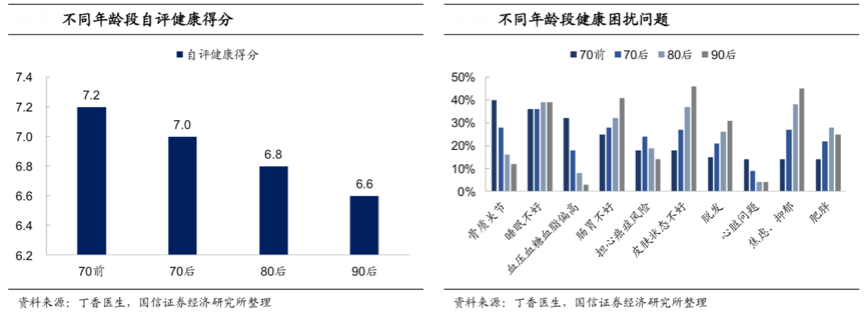 國(guó)內(nèi)食品消費(fèi)經(jīng)過(guò)多年,消費(fèi)升級(jí)使大家對(duì)食品更關(guān)注其品質(zhì)化、價(jià)值化,國(guó)內(nèi)消費(fèi)主力人群集中在80后邊、90后人群,其對(duì)自身生活品質(zhì)的要求促生了大量的“健康食品消費(fèi)”,根據(jù)丁香醫(yī)生、國(guó)信證券經(jīng)濟(jì)研究所等綜合資訊表明,80后、90后對(duì)骨質(zhì)關(guān)節(jié)、睡眠、三高等健康問(wèn)題尤其關(guān)心,更愿意為此支付費(fèi)用。
