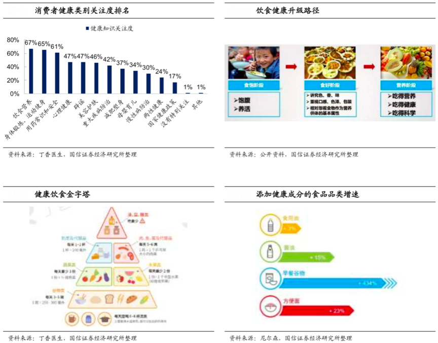 “健康”是所有人都關(guān)注的,強(qiáng)大的健康意識(shí)已經(jīng)成為食品消費(fèi)的主流觀念,強(qiáng)化食品品質(zhì)健康,亮化健康消費(fèi),成為80后90后消費(fèi)人群的“食品消費(fèi)關(guān)鍵點(diǎn)”,根據(jù)丁香醫(yī)生、國(guó)信證券經(jīng)濟(jì)研究所等綜合資訊表明,“飲食健康”位居消費(fèi)者健康類(lèi)別關(guān)注度排名第一位,國(guó)民飲食健康消費(fèi)已經(jīng)從溫飽消費(fèi)、食好消費(fèi)升級(jí)為“營(yíng)養(yǎng)健康”,“健康消費(fèi)”已經(jīng)成為食品消費(fèi)的大主流、強(qiáng)趨勢(shì)。