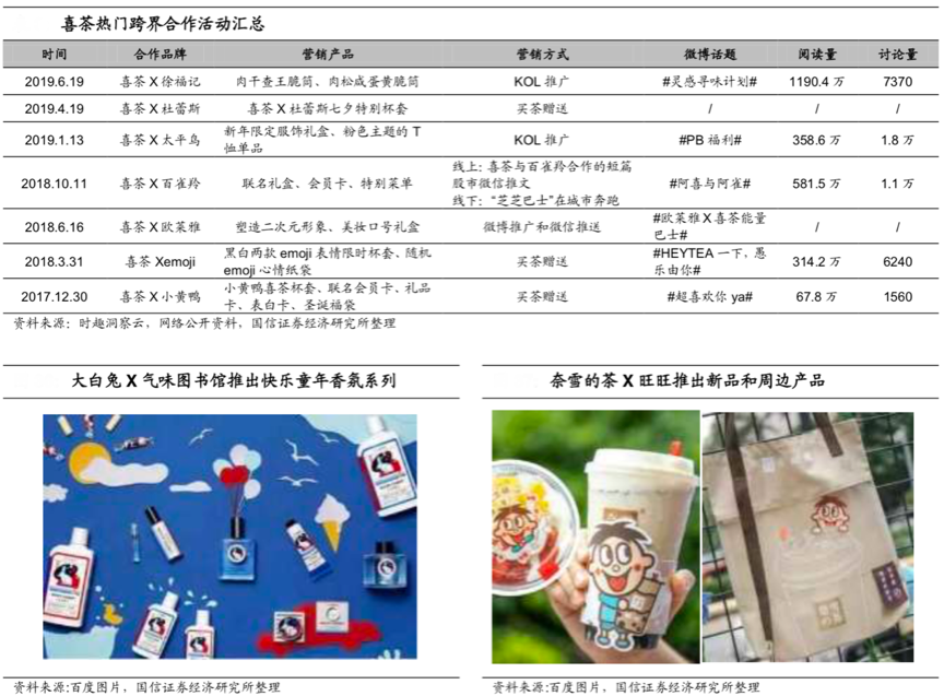 “聯(lián)合品牌營(yíng)銷(xiāo)”近年來(lái)比較熱門(mén),大量品牌紛紛聯(lián)合同檔次、同品質(zhì)品牌開(kāi)展“聯(lián)合活動(dòng)”,以“跨界營(yíng)銷(xiāo)”的方式放大自身的品牌能量,并強(qiáng)化多產(chǎn)品聯(lián)合促銷(xiāo)提升品牌影響力。根據(jù)時(shí)趣洞察云、網(wǎng)絡(luò)公開(kāi)資料、國(guó)信證券研究所等綜合資訊表明,近年來(lái)大火的“喜茶”先后與小黃鴨、歐萊雅、太平鳥(niǎo)等知名品牌開(kāi)展了跨界合作,小的活動(dòng)多是買(mǎi)贈(zèng)等活動(dòng),大的活動(dòng)則是KOL推廣及定制單品等創(chuàng)新活動(dòng),活動(dòng)大多引發(fā)用戶大量閱讀及討論,更有奈雪的茶、大白兔、鐘薛高等依托跨界營(yíng)銷(xiāo)賺足眼球。