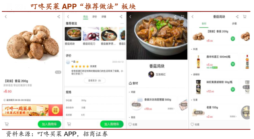 經(jīng)典案例:據(jù)招商證券等資訊表明,叮咚買(mǎi)菜和菜譜類(lèi) APP下廚房合作,拉取下廚房用戶(hù)寫(xiě)的菜譜,在叮咚買(mǎi)菜 APP“吃什么”板塊將各式菜譜展示給用戶(hù),如“家常菜”、“一人食”、“下酒菜”等。