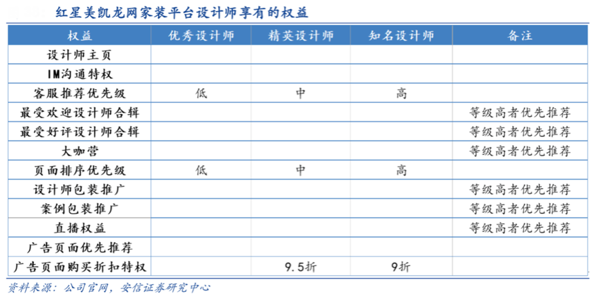 經(jīng)典案例:根據(jù)公司官網(wǎng)、安信證券研究中心等綜合資訊表明,其推出了“設(shè)計(jì)家裝就一站”的紅星美凱龍網(wǎng)家裝平臺(tái),其主要針對(duì)都市新中產(chǎn)的家裝需求,為客戶提供設(shè)計(jì)、施工、監(jiān)理、選材、軟裝 等一條龍服務(wù)。平臺(tái)對(duì)入駐商戶進(jìn)行考核,根據(jù)設(shè)計(jì)師的等級(jí)配套相應(yīng)的優(yōu)先級(jí),包括客服推薦優(yōu)先級(jí)、頁(yè)面排序優(yōu)先級(jí)等。截至2018 年末,與公司的互聯(lián)網(wǎng)平臺(tái)簽約的高端家裝公司共計(jì) 2364 家,通過(guò)平臺(tái)預(yù)約裝修的客戶近 10 萬(wàn)人。