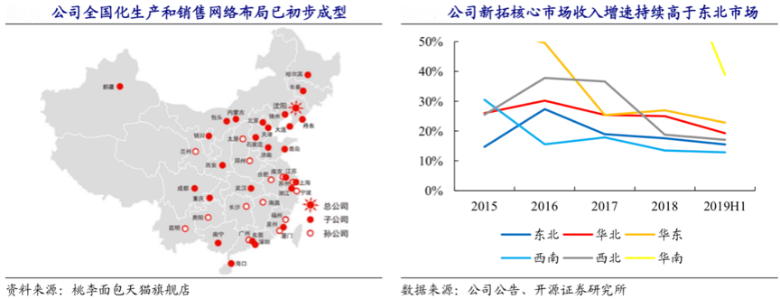 經(jīng)典案例:根據(jù)公司公告、桃李面包天貓旗艦店、開源證券研究所等綜合資訊表明,2005-2015年,公司逐步由東北地區(qū)走向全國化布局,在西安、上海、深圳、武漢等各區(qū)域內(nèi)的核心城市設(shè)立中央工廠及子公司。截至2019 年上半年,公司已在全國 17 個中心城市建立中央工廠,共計設(shè)立 38 家子公司,全國化的生產(chǎn)和銷售網(wǎng)絡(luò)布局已初步成型。