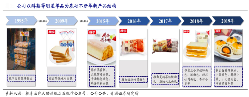 經(jīng)典案例:根據(jù)桃李面包天貓旗艦店及微信公眾號、公司公告及開源證券等綜合資訊表明,其產(chǎn)品主要以面包為主,月餅、粽子等節(jié)假日專供產(chǎn)品為輔,軟式面包、起酥面包、調(diào)理面包 3 大系列 30 余個品種,合計占據(jù)總營收的 97%以上。目前醇熟、天然酵母等明星單品年收入貢獻均已超過 10%。