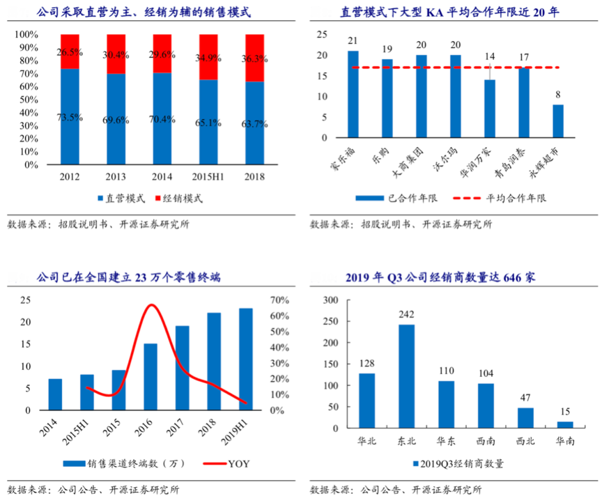 經(jīng)典案例:根據(jù)公司公告、招股說明書、開源證券研究所等綜合資訊表明,“桃李面包”與沃爾瑪、大潤發(fā)等大型商超之間的合作年限已將近 20 年,積累了產(chǎn)品鋪貨速度、陳列規(guī)模占比、訂單反饋及時性等方面的競爭優(yōu)勢。并要求與公司合作的經(jīng)銷商只能銷售桃李品牌面包,不能售賣其他品牌,具備較強的排他性。截至 2019 年 Q3 公 司已在東北、華北、西北、西南、華東等 17 個中心城市建立約 23 萬個零售終端,經(jīng)銷商數(shù)量已經(jīng)達到 646 家。