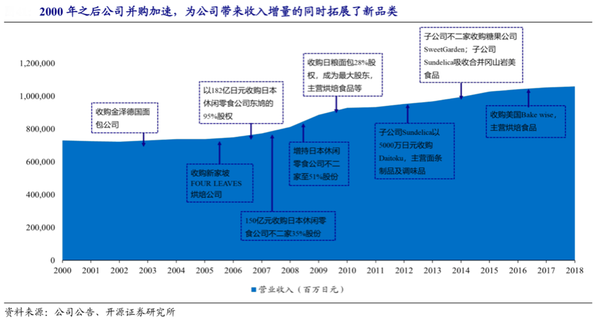 經(jīng)典案例:山崎面包近 10 多年來,面包、日式和西式點心等舊品類營收增速持續(xù)疲軟,收入增長主要來源于并購和新品類在已有渠道的放量。2000 年后公司相繼并購了金澤德國面包公司、新加坡 FOUR LEAVES 烘焙公司、日本東鳩休閑食品公司、日本不二家休閑食品公司、日糧面包公司和美國 Bakewise 烘焙公司。不僅繼續(xù)在全球范圍內(nèi)繼續(xù)拓展主業(yè),同時拓展了面條 以及糖果、薯片、泡芙、曲奇餅、冰淇淋和巧克力等休閑食品的品種。