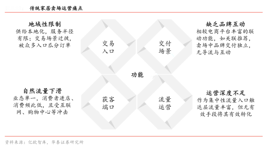 家居賣場有自己的運營痛點,有些“運營痛點”還比較痛,值得家居賣場新零售電商經(jīng)營者深度洞察、創(chuàng)新解決。根據(jù)億歐智庫、華泰證券研究所等綜合資訊表明,傳統(tǒng)家居賣場運營痛點主要集中在地域、流量、品牌互動及運營深度等方面,其核心原因在于傳統(tǒng)的家居賣場依然是以“家居產(chǎn)品銷售及部分服務(wù)”為盈利模式的,以“家居賣場”流量運營為核心驅(qū)動力的,商業(yè)模式相對滯后,無法適應(yīng)數(shù)字化技術(shù)驅(qū)動下的新家居、新零售和新商業(yè)的深度變革。