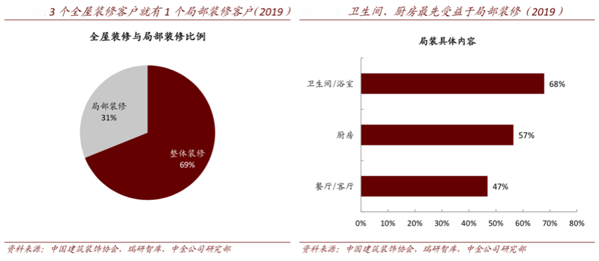 隨著品質(zhì)家居消費及個性化家裝消費的興起,大量的互聯(lián)網(wǎng)家裝企業(yè)日益關注集成家裝的表達,“集成家裝”成為消費的新特色。根據(jù)中國建筑裝飾協(xié)會、瑞研智庫和中金研究部等綜合資訊表明,2019年中國建筑裝飾協(xié)會的數(shù)據(jù)顯示,局部裝修占整個裝修消費群體的31%左右,每3個裝修客戶中就有1個局部裝 修,從品類來看,57%的局部裝修消費者會選擇更新廚房,68%的消費者會更新衛(wèi)生間,櫥柜、衛(wèi)浴等品類日益成為“局部裝修先行者”。